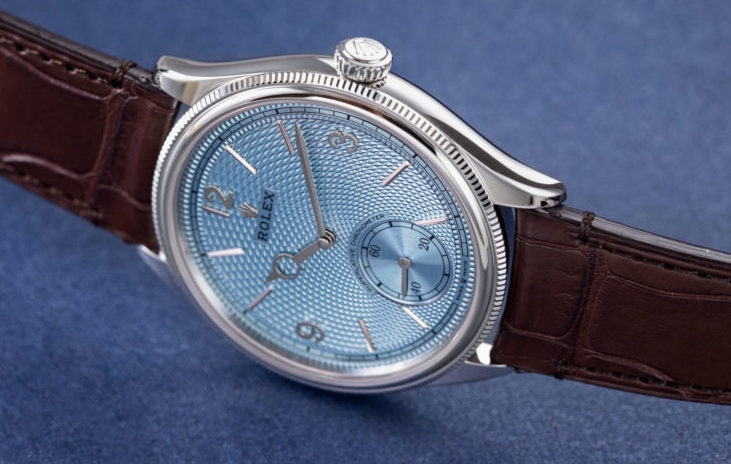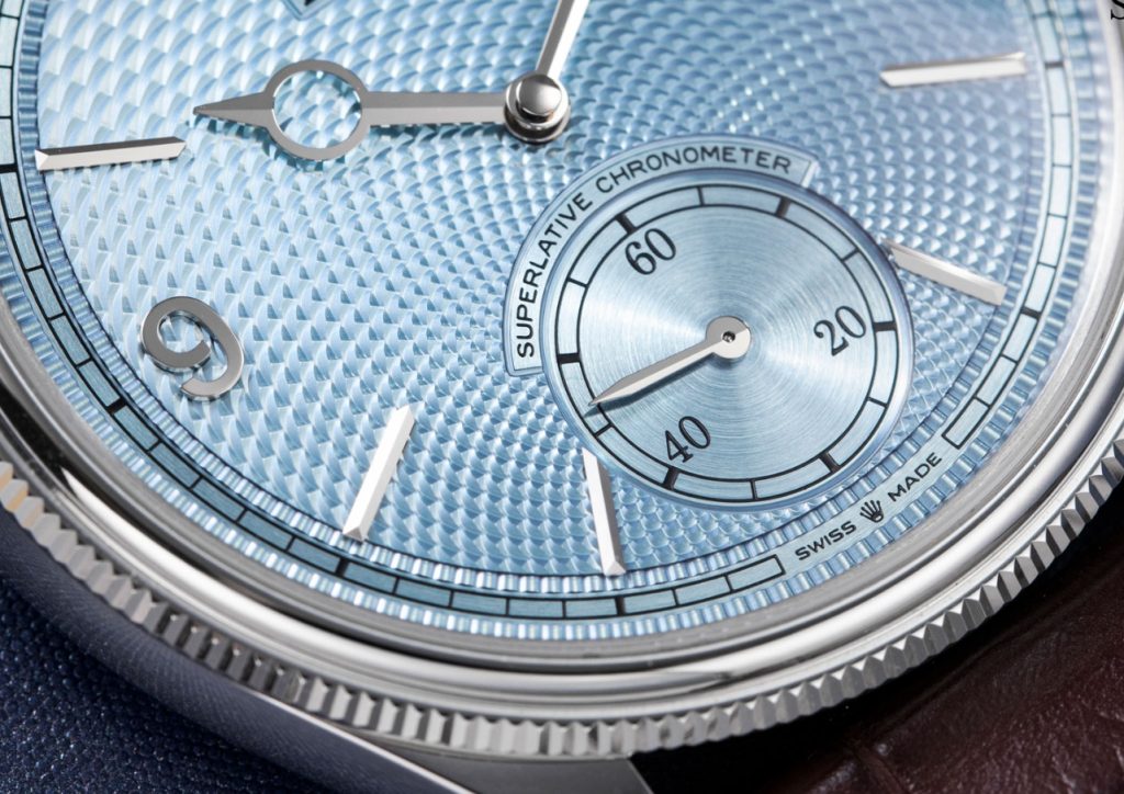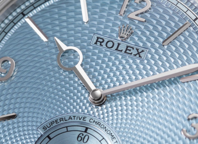 The dial is finished with a “rice grain” motif arranged radially with the pattern radiating outwards from the subsidiary seconds. It’s a traditional guilloché and certainly one that is suitable for a relatively low-key dress 1:1 copy Rolex watches. But because it’s in “ice blue” rather than a classical silver, the engine turning feels a bit more modern than it otherwise would.