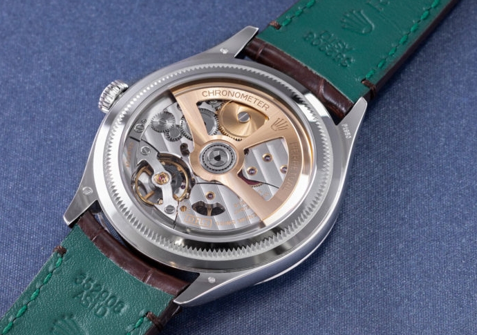 Sitting under the sapphire back is the cal. 7140, an all-new calibre created for the 1908. It’s a thin movement to fit the slim case, but still manages to incorporates all of the features standard in latest generation Rolex movements.